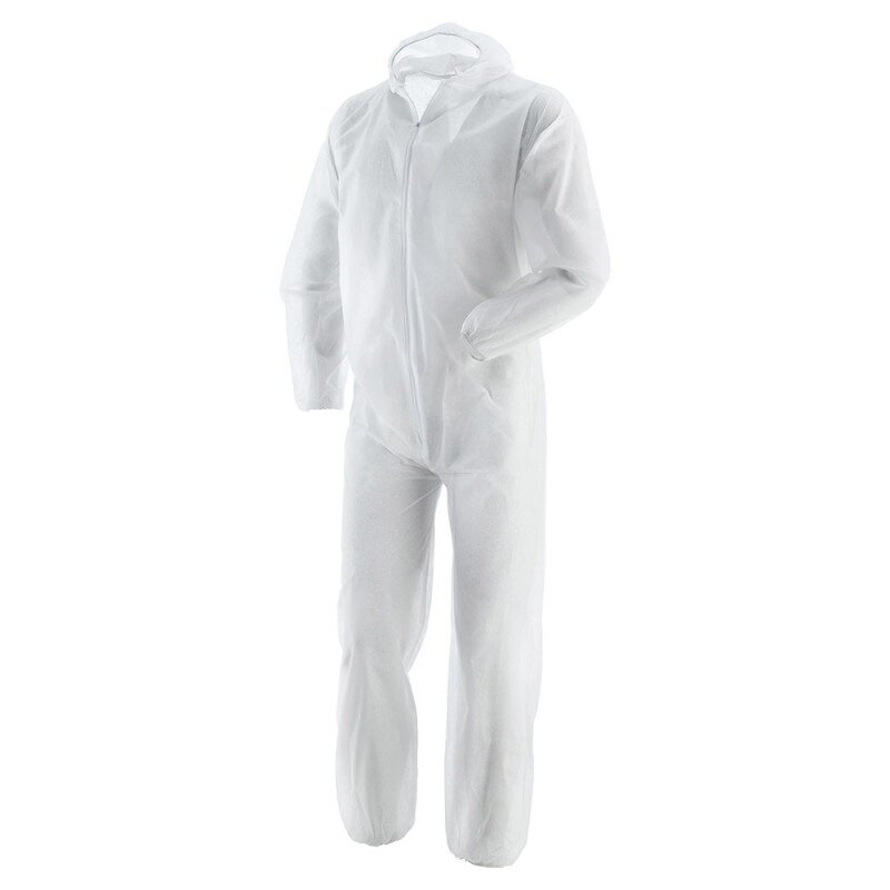 Tuta in TNT di polipropilene PP (40 gr/mq), con elastico ai polsi, alle caviglie e nel cappuccio, chiusura frontale con cerniera. Disponibile nei colori bianco e azzurro, e nelle taglie M – L – XL – XXL.