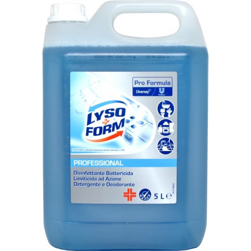Lysoform Professionale è un disinfettante ad azione detergente e deodorante per uso professionale Consigliato per la disinfezione e la pulizia di tutte le superfici e pavimenti lavabili in ospedali, scuole, uffici, guardaroba, bagni, locali pubblici, palestre e comunità in genere.